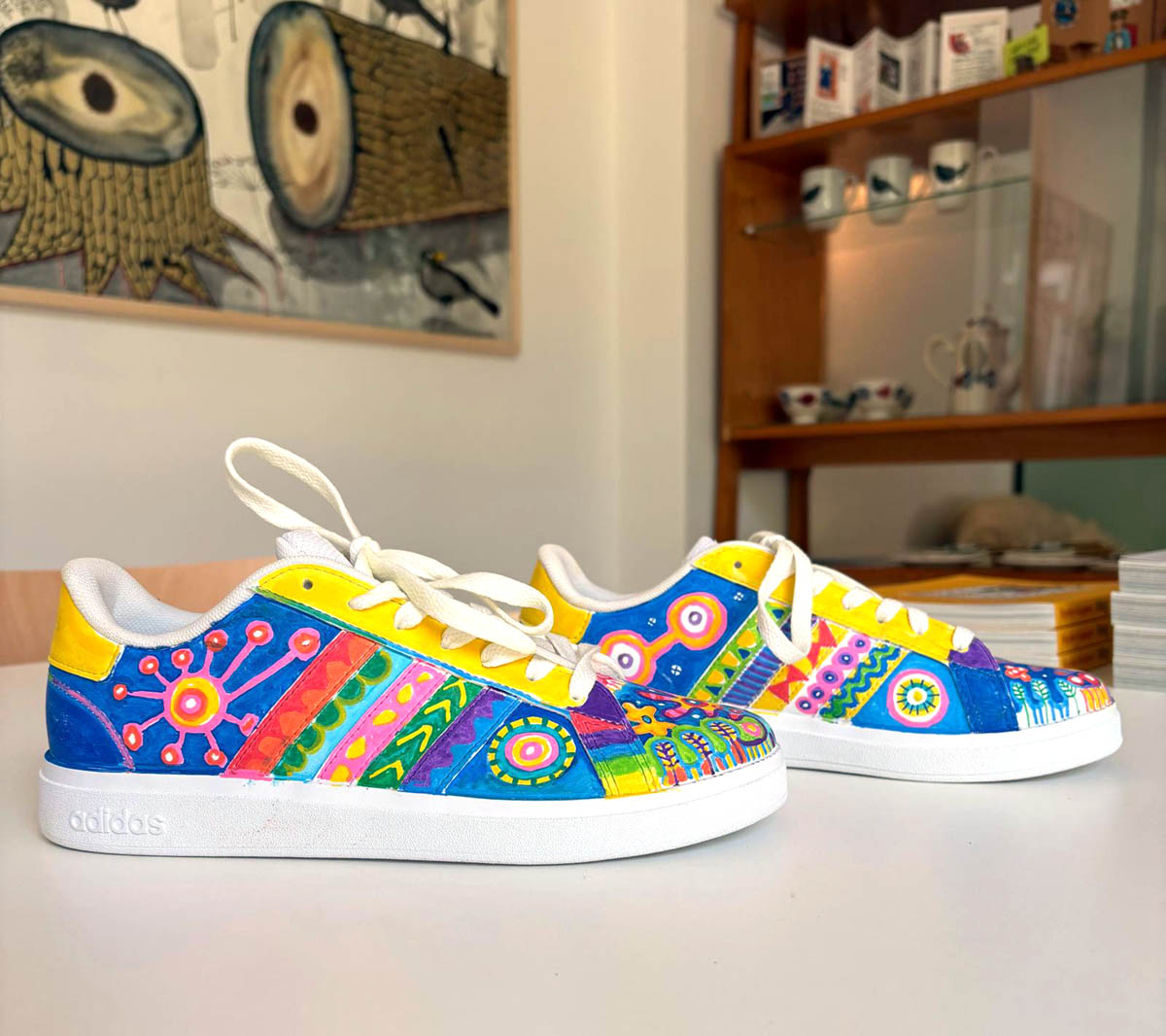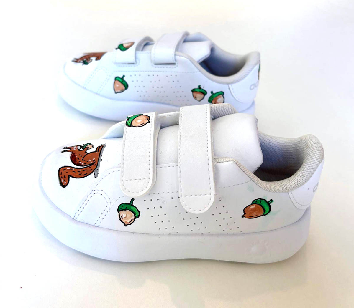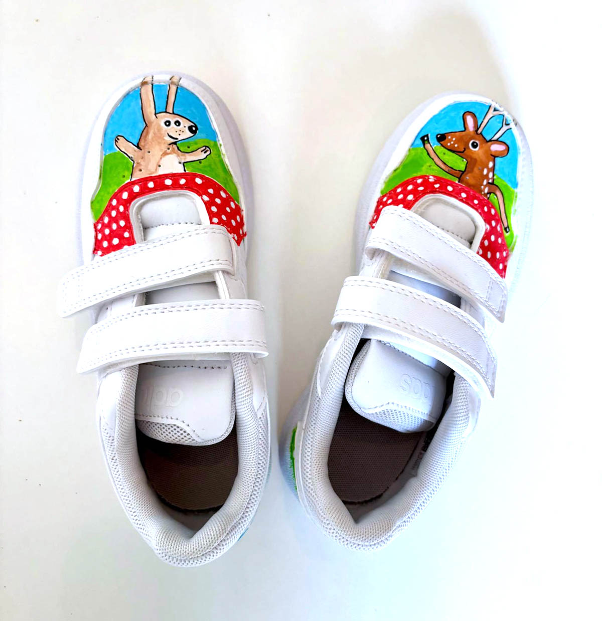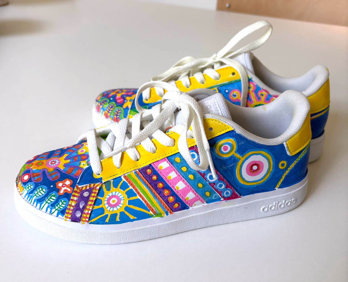 Wat de sneakers betreft: jij schaft ze aan en bezorgd ze ons. Zo ben je er zeker van dat ze passen. We beschilderen ze met Posca en behandelen ze met een spray waardoor de tekening er goed en watervast op blijft zitten.